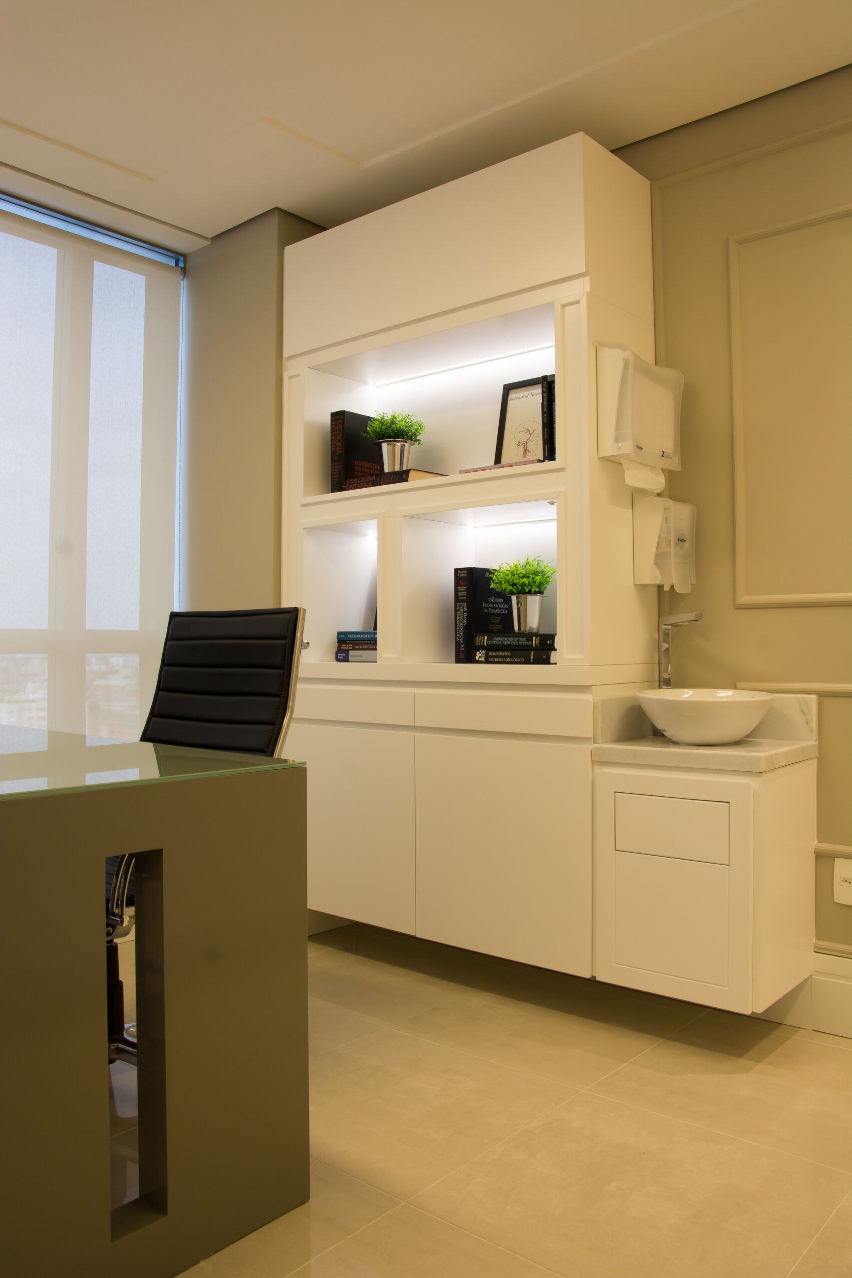 Na marcenaria em laca branca dos consultórios, foram criados nichos, a pedido do proprietário, intercalados com armários fechados. As mesas com design diferenciado, criadas pela designer, foram executadas em laca brilho na cor fendi.